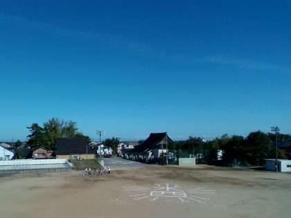 3階からスキー山を見下ろしたら、1年生が外で国語の学習をしていました。青空の下、とても気持ちよさそうです。