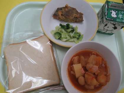 19日(木)今日の献立 公開日 2023/10/19 更新日 2023/10/19 給食室 ・食パン ・牛乳 ・魚のえごま揚げ ・そえ野菜 ・豆とベーコンのトマト煮 ※11時45分、検食終了。異常ありません。 彩りもよく美味しく出来上がっています。 毎週木曜日は、パン食の日です。