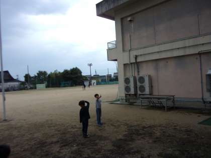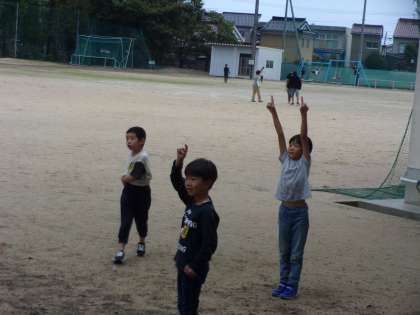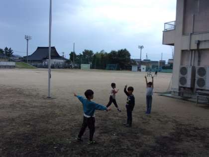 元気よく外へ出たのは1年生。トンボの大群に出会い、捕まえようと人差し指をぴんと伸ばしています。でもなかなかトンボは指にとまってくれないようです。秋の自然と仲よしです。