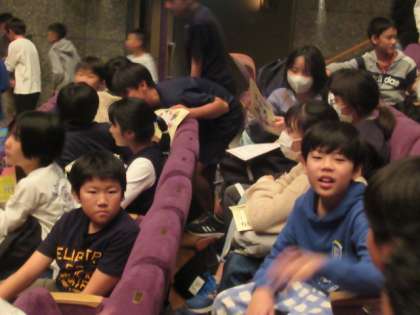 今年度も、日頃から下級生のために、学校のために、地域のために力を尽くしてくれている6年生(約3,300名、午前午後に分けて2回)が招待されました。通常公演であれば入場料が必要ですが、交通費のみで観劇させていただきました。