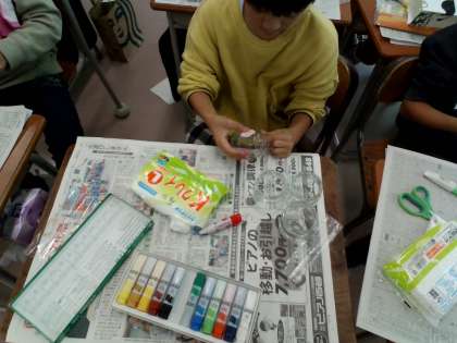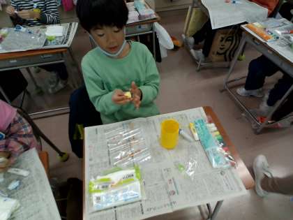 家からたくさんの空き瓶を持って来た子供、白い粘土に絵の具で色を混ぜていく子供、それぞれがオリジナルの入れ物を作る準備をしています。