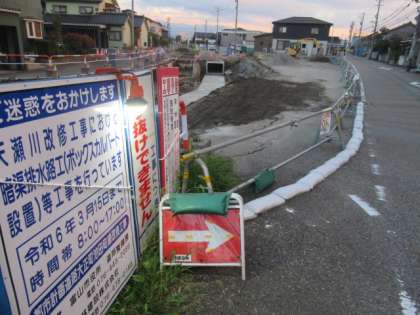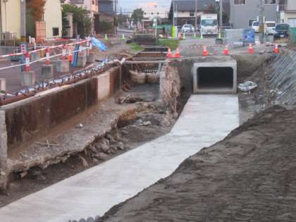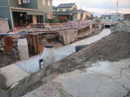 学校の東側、水橋西部地区センターの北側にある用水を暗渠にする工事が続いています。お気を付けください。