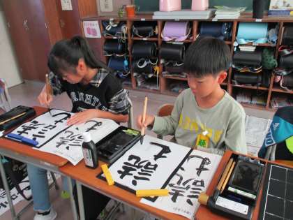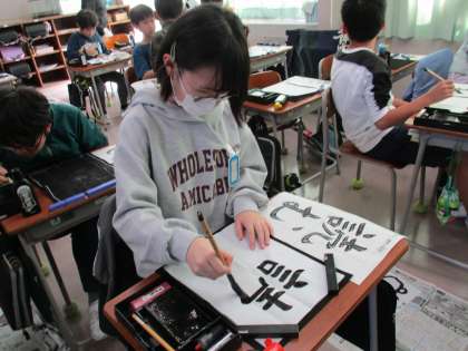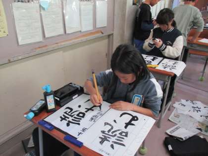 今日の課題は「読む」です。漢字と仮名の大きさに気を付けて書きます。丁寧に作品づくりに取り組んでいました。