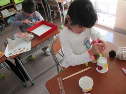 まつぼっくりけん玉、どんぐりころころ、マラカス・・・見付けた秋で「おもちゃ」をつくっています。