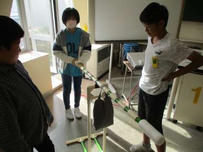 てこを使って小さい力で物を持ち上げるにはどうすればよいかを実験しました。