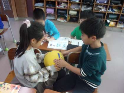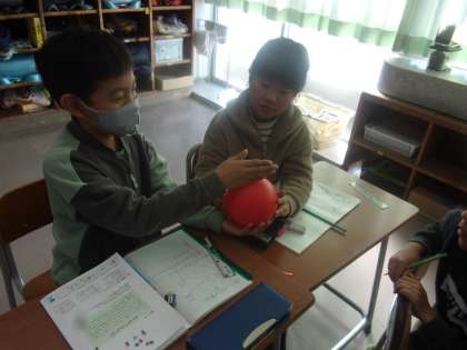 「球」とは、どのような物なのかを、いろいろなボールなどをみて学習しました。