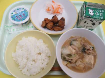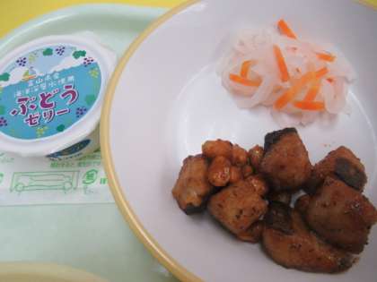 13日(月)今日の献立 公開日 2023/11/13 更新日 2023/11/13 給食室 ・ごはん ・牛乳 ・魚と大豆のえごまからめ ・おすわい ・とやまのみそ野菜なべ ・海洋深層水ゼリー ※11時45分、検食終了。異常ありません。 今日は、学校給食「とやまの日」です。富山の食材がふんだんに使用されています。 デザート付きなのも、うれしいですね。