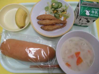 16日(木)今日の献立 公開日 2023/11/16 更新日 2023/11/16 給食室 ・米粉コッペパン ・牛乳 ・バナナ ・わかさぎのフリッター ・クラムチャウダー ・コールスローサラダ ※11時45分、検食終了。異常ありません。 見た目がそっくりな「クラムチャウダー」と「クリームシチュー」。どこが、どう違うのでしょうか。調べてみるのも楽しいですね。クラム(貝)が入っているか、お肉が入っているかの違いでしょうか?