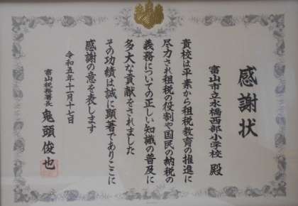 租税教室や租税バスの実施、税に関する作品応募など、本校が租税教育の推進に貢献しているということで、税務署より感謝状と記念品をいただきました。