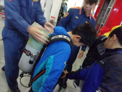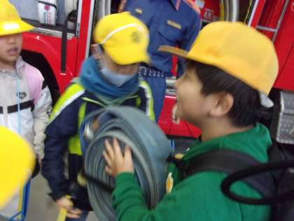 消防車の中にあるホースをもたせてもらったり、ボンベをかつがせてもらったりしました。