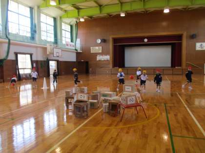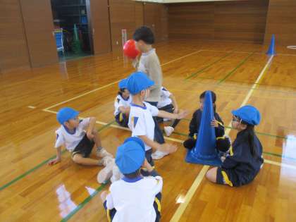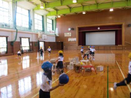 的当て遊び(「投」運動遊び)。団で振り返ったり練習したりしながら、パワーアップを目指しています。