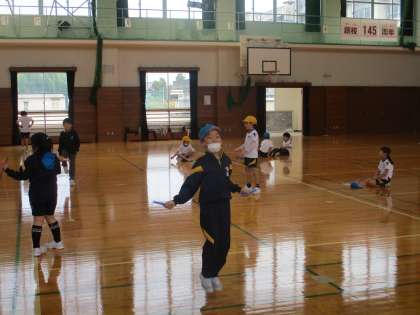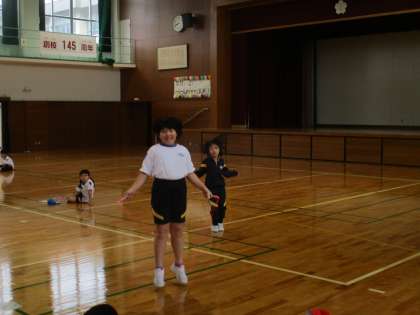 「前跳び」で跳び続けられるタイムを計りました。ひっかかっても跳び続け、自分の限界にチャレンジしました。
