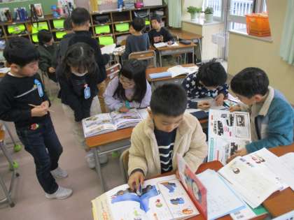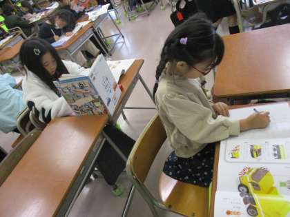 自動車図鑑をつくります。本を使って、しごとやつくりを確かめています。