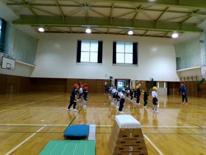 朝から楽しみにしていた跳び箱教室が始まりました。念入りに準備運動をしています。