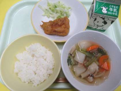 28日(火)今日の献立 公開日 2023/11/28 更新日 2023/11/28 給食室 ・ごはん ・牛乳 ・ポークパコラ ・ゆでキャベツ ・かぶのスープ ※11時50分、検食終了。異常ありません。 「パコラ」は、インドの「天ぷら」のような(粉をつけて油で揚げる)料理だそうです。今日の「ポーク(豚肉)パコラ(天ぷら)」には、ほんのりカレー味がついています。インド料理だから?