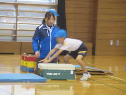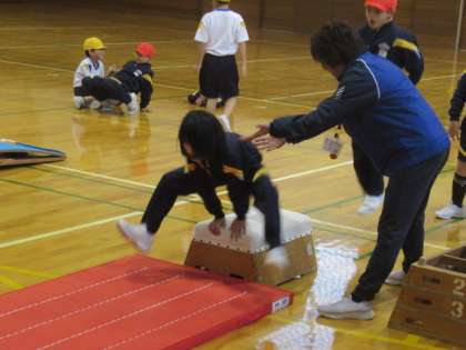 今日は、スポーツ指導員の方に跳び箱の跳び方を習いました。手のつき方や踏み切りの仕方、きれいに跳ぶためのコツを練習しました。