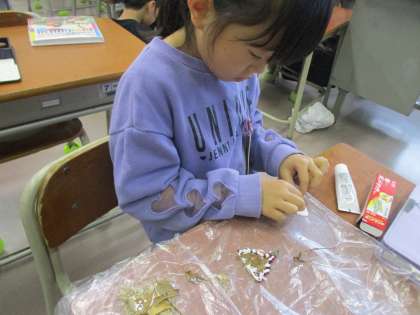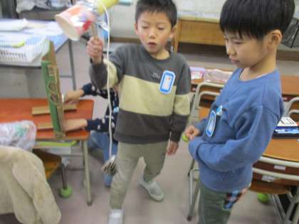 秋のおもちゃづくりが進んでいます。友達と遊んでみたり・・・