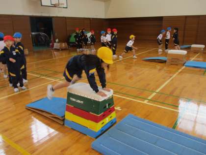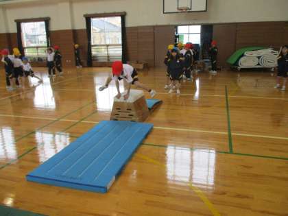 「手を前の方についたらいいよ」「跳び箱を手で『ぐいっ』と押して・・・」友達にコツを教わって、がんばっています。