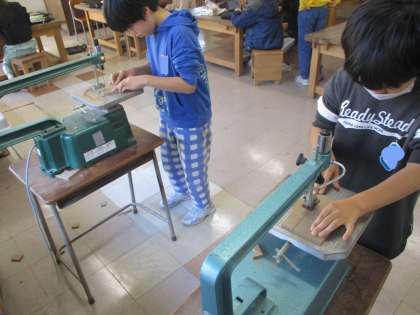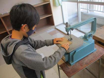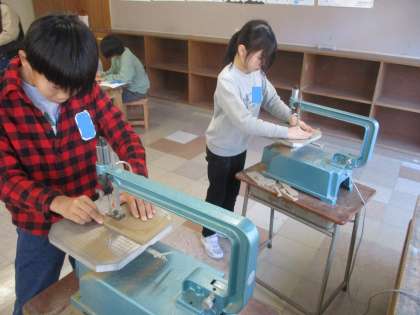 テープカッターを作っています。 糸のこぎりに苦戦しながらも板をしっかり押さえ、丁寧に切っています。