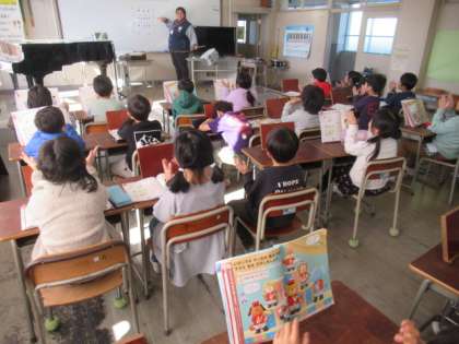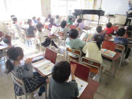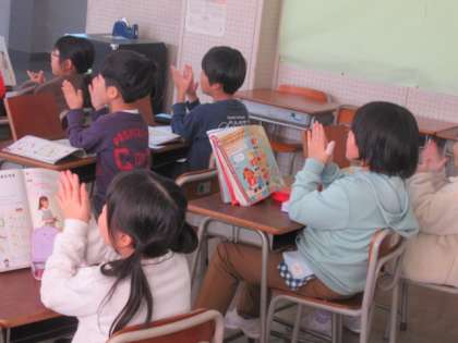 タン(四分音符)、ターン(二分音符)、タタ(八分音符) 手拍子でリズムの学習をしています・・・上手ですね!