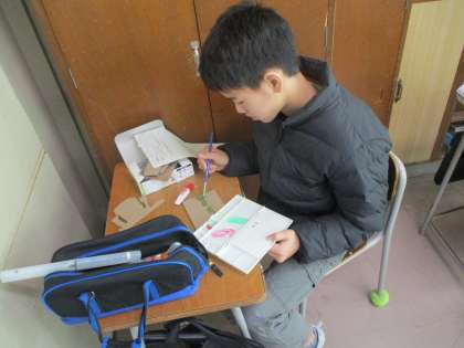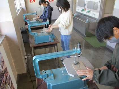 1枚の板からテープカッター作りです。 切りたい方向に板を回転させ、安全に進めています。