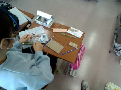 一枚の板を糸のこぎりで切って、テープカッターを作っています。動物のふわふわの形を切り取った部分を使って、草を表現している子供がいました。