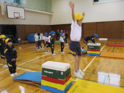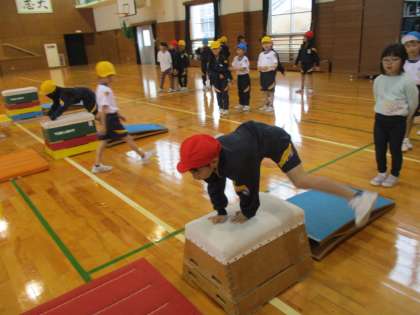 「手を奥に着いて」「両手で跳び箱をぐいっと押して」
