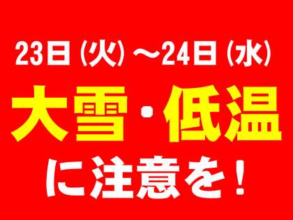 本日23日(火)夕方から雪が降り始め、夜には激しくなるようです。不要不急の外出を控えるなど、ご配意ください。