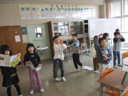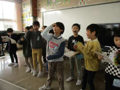 ♪「アーイアイ」「アーイアイ」 組に分かれ、楽しそうに歌っています。