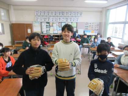 6年生 大谷グラブ(グローブ)贈呈 公開日 2024/01/31 更新日 2024/01/31 6年生 ついに! 本校にも「大谷グラブ(グローブ)」が届きました! お昼の校内放送で紹介し、各教室で子供たちに手渡しました。 代表3名に手渡した後、全員がグラブを持ったり手にはめたりして、感触を味わいました。 大谷選手の「子供たちに夢を与え、勇気づけたい!」というメッセージが伝わったようです。