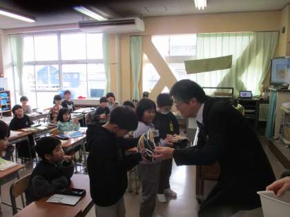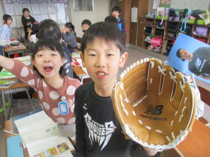 大谷選手が全国に配ったグローブが届きました。一人一人グローブに触れました。