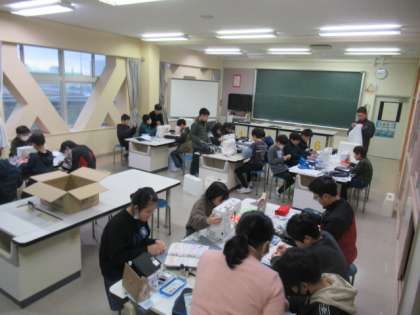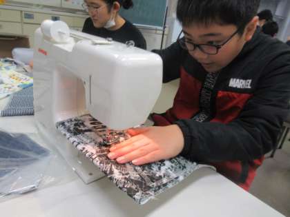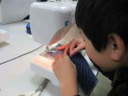 地域の教育ボランティアの方にも補助していただきながら、ミシンで写真入れなどを作っています・・・