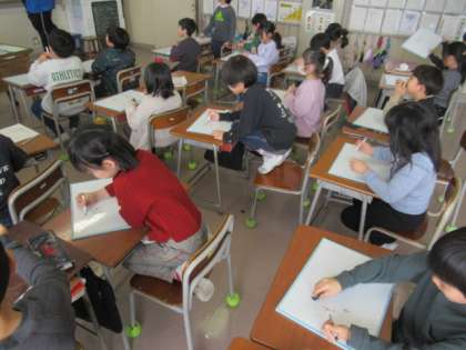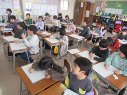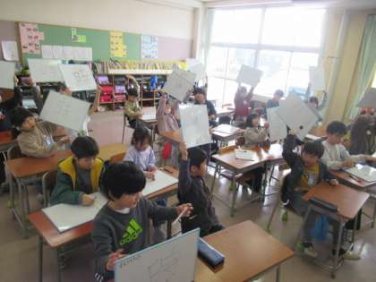 子供たちが考えた漢字の合体クイズをしました。「日+十=早」など、習った漢字を分解してたくさんの問題を作ったり、友達が作った問題を解いたりしました。