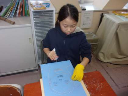 今日は、彫刻刀を使い、版画の自画像をほりすすめました。