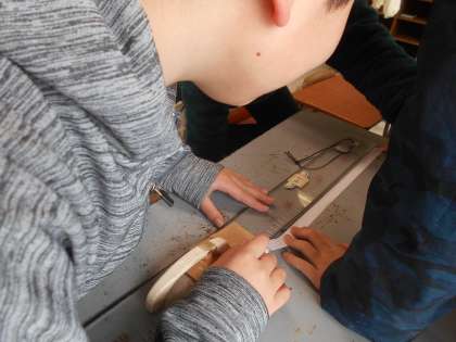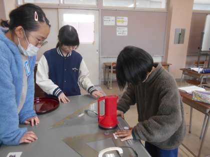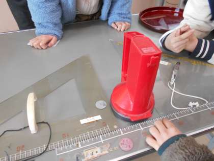 円周の長さを求める方法を考えています。身の回りにある様々な道具を用いて、熱心に考えている子供たちです。