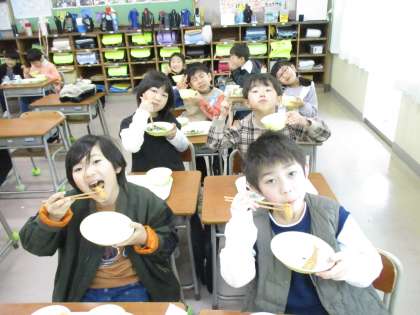 給食です。今日もおいしくいただきました。1年間で、もりもり食べられるようになってきましたね!