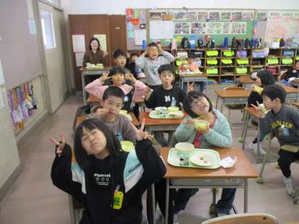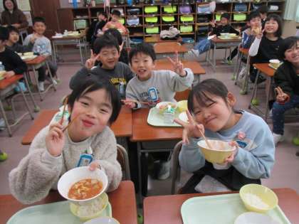 給食です。今日もおいしくいただきました。1年間で、もりもり食べられるようになってきましたね!