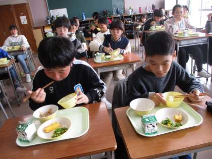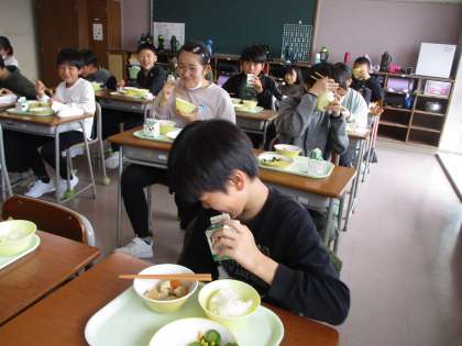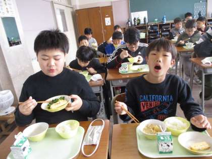 進級して、はじめての給食です。もりもり食べています!ボウルも食缶もすっからかんになりました。