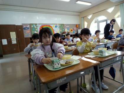 1年生にとっては小学校に入って初めての給食でした。調理員さんからのメッセージを聞いて、美味しくいただきました。