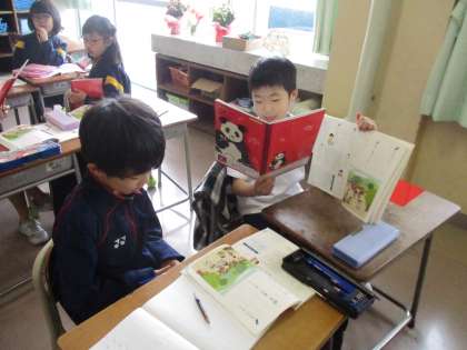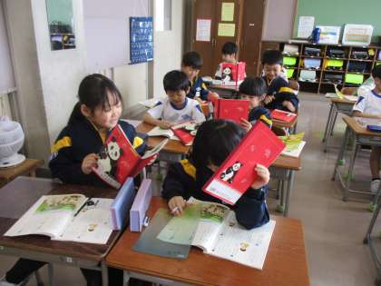 教科書の絵を見て、クイズをつくって出し合っています。