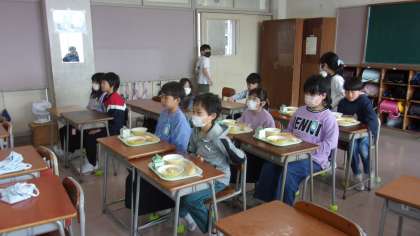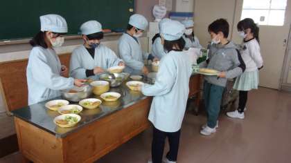 給食当番の子供は、素早く着替え、どの皿も同じ量になるように配膳しています。他の子供たちは、静かに待っています。