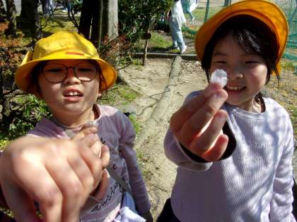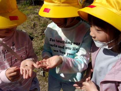 天瀬の森で春の生き物や植物を探しました。桜の花びらの数を数えたり、ダンゴムシの赤ちゃんを見つけたりと、楽しい理科の学習でした。