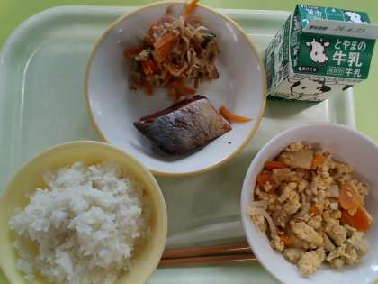 4月16日(火)今日の献立 公開日 2024/04/16 更新日 2024/04/16 給食室 ・ご飯 ・牛乳 ・ふくらぎの照り焼き ・はりはりソテー ・卵とじ 検食、異常なし。 はりはりソテーは、切り干し大根の味が染み込んでいてとても美味しかったです。ところで、なぜ「はりはりソテー」という料理名なのでしょうか。