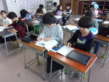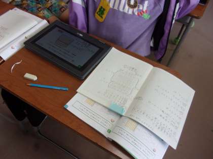 図を使ってかけ算のいろいろな求め方を考えました。一人一台端末のドットの○を使いながら、真剣に考えています。