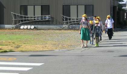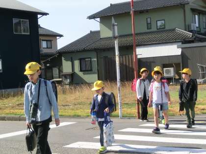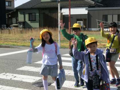1年生の歩くスピードに合わせている上級生、横断歩道の手前でしっかり止まり、後ろに続く下級生に声をかけて渡るリーダーさん、いつも下級生を気遣いながら登校してくれてありがとう。