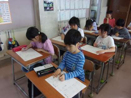 算数の朝学習です。授業で学習したところの復習プリントを解いています。