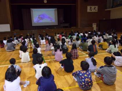 今日の給食のほたるいかを楽しみにしながら、しっかりと話を聞いています。