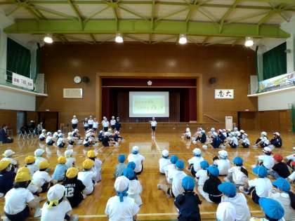 各委員会の委員長が、全校児童の前で抱負を述べました。