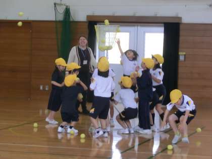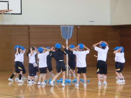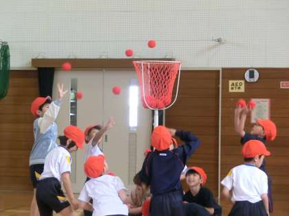 チェッコリのかわいい音楽に合わせて踊っていたかと思うと、次の瞬間玉を持って玉入れ開始。下投げ、上投げ様々ですが、どうすればたくさん玉が入れられるか、これから、まだまだ練習が必要ですね。