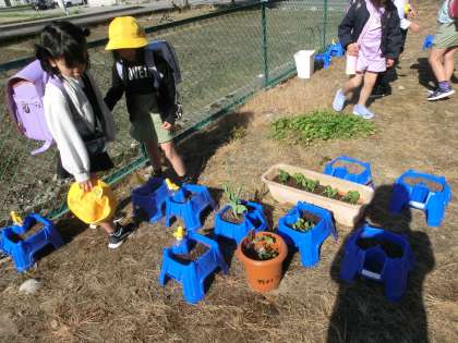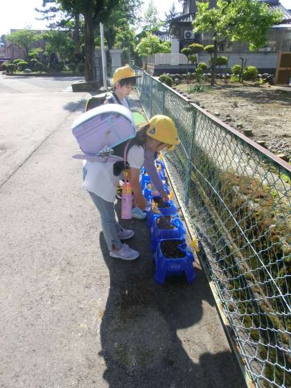 登校するやいなや、昨日種を植えたアサガオの鉢へ駆け寄る子供たち。水をあげたらいいかどうか迷っている1年生に、「今日は暑くなるからたっぷり水やりしたらいいよ」と声をかけている上級生の姿がありました。